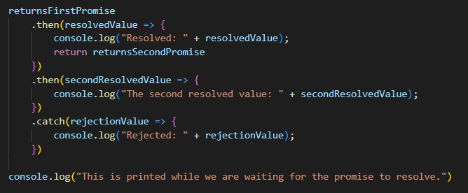 After this, you have to assign some code telling the program how to handle the resolved or rejected response. This is done by “chaining” .then() methods to the promise. When adding a .then() method, you feed it “handlers”. Handler functions handle the returned value from a settled promise. As a promise can either resolve or reject, we also need a succes-handler and rejection-handler. There are 2 ways of doing this. Either you give .then both handlers, beginning with the succes-handler, then as a 2nd parameter add the failure-handler. Another way of doing this, and a more clear way of expressing how the promise should react to success and failure is chaining a .catch() method after the .then() method. Doing this, you feed .then() the succes-handler and .catch() the failure-handler. This could look like this: