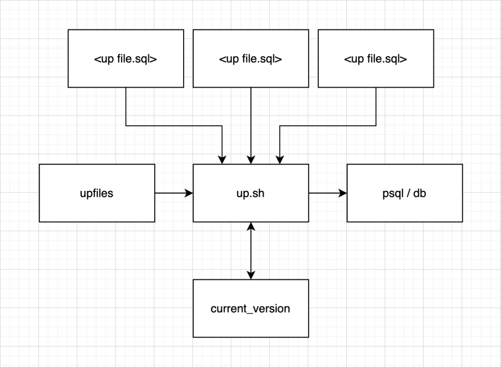 In short: up.sh asks current_version for the <current_version>. It then asks upfiles for available upfiles. up.sh then filters out up files with a lower or equal version number and runs them at the database using the psql command. Finally, the current version of the last and highest version is then written back to current_version for future reference.