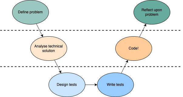 And now we’ll perform the entire thing in reverse. Writing a few but strategic test cases. When they succeed we can perceive the work as done. Then we continue to the code. The intention behind working analytic and structured is, that the actual coding will be extremely precise. You know exactly what to do. Maybe you come across additional problems to solve as you dive deeper into the details, but all in all, the biggest issues will be solved in the analysis. Finally – the context – the business problem – is now solved.
